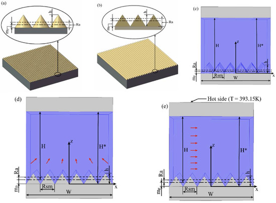 Schematic of the roughness texture in (a) the cone model and (b) the groove model, and the schematic of the flow on the (c) Cone model, (d) Groove-P model and (e) Groove-V model.