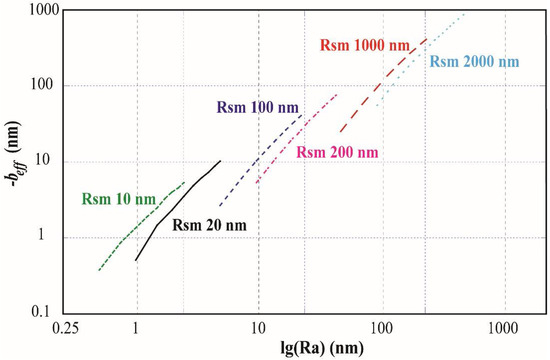 The surface roughness will avoidably affect the flow rate of the fluid flow, and this surface roughness-dependent flow rate can be characterized by the effective boundary slip induced by the surface roughness. Assuming the surface roughness-induced effective slip on the lower rough surface is beff, then the relationship between effective slip beff and flow rate Q can be described as [47]: