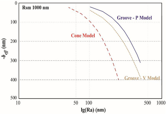 where dp/dx is the pressure gradient. Therefore, the effective slip beff can be obtained with Equation (3). The height H of the channel need to be calculated for each model by H = H* − mp considering the surface roughness.