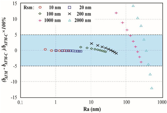 To check the validity of the correction method, in this study, the reference surface position was set at the top point of surface morphology to simulate the slip obtained experimentally with AFM, labeled as bAFM. Then the results were corrected by simply subtract the distance between the two different reference surface position which is referred to the Rpm of the surface. The corrected effective boundary slip is marked as bAFM-C. Then the error of the corrected slip are obtained and shown in Figure 4. In Figure 3, it is shown that with smaller Rsm, the errors are always smaller than ±5% which is acceptable for slip measurement. However, when the Rsm reaches 1000 nm or even 2000 nm, the error can be as large as 15%. Error as 15% for boundary slip measurement seems to be too large, however, it should be noticed that the error of the uncorrected experimentally measured slip is in range of 60–600%, as a result, the correction is still necessary and the error is acceptable, especially when Rsm is smaller than 200 nm.