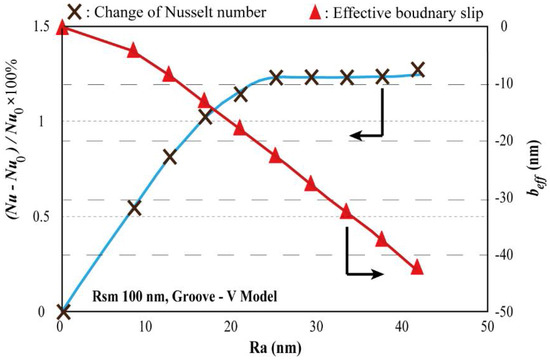 Increasing rate of Nusselt number for a pressure-driven flow in a micro channel with one-side rough surface in Groove-V model. The Rsm is fixed at 100 nm. The effective boundary slip are also shown.