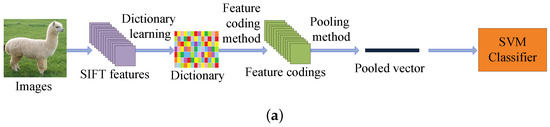 The traditional feature coding framework can be divided into five steps: (1) extracting the SIFT [17] features from all the images; (2) solving an minimization problem from all the training SIFT representations to obtain a dictionary; (3) computing the feature codings by a specific feature coding method; (4) pooling the feature codings to get the pooled vectors; and (5) training the final support vector machine (SVM) classifier by the pooled vectors to get the classification result. The block diagram of the traditional feature coding framework for image recognition is shown in Figure 1a.