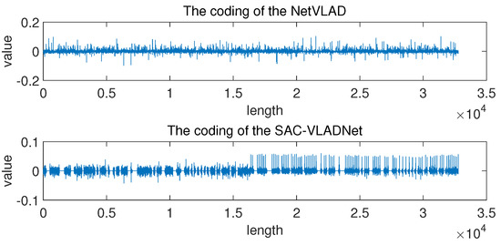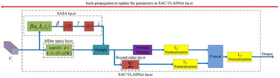 From Equation (5), it is clear to see that the original NetVLAD model only uses the first-order statistical information. The NetVLAD layer and the traditional pooling methods achieve the aggregated features from the spatial scale without considering the feature interaction between each channel. The proposed SAC-VLADNet exploits the covariance matrix to get the interactive feature which can efficiently enhance the representation ability. The final aggregated feature in the proposed network is the concatenation of the first-order and the covariance statistical information. The covariance statistical information of Equation (13) is written as: