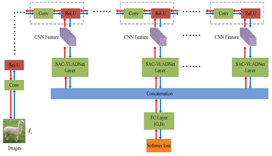 The M-SAC-VLADNet is also an end-to-end feature coding model. We first obtain the initialization parameters in each SAC-VLADNet layer, and then train the entire M-SAC-VLADNet by an end-to-end method. Based on the back propagation algorithm, the gradient information of the softmax classifier can be used to update the parameters in each SAC-VLADNet layer. Because of this, the proposed M-SAC-VLADNet can be trained in a supervised way. We define the feed operation of the M-SAC-VLADNet as the blue arrow in Figure 4 and define the back operation of the M-SAC-VLADNet as the red arrow in Figure 4.