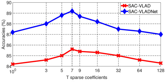 From Equation (10), it is clear to see that the SASAC layer only considers the largest T probabilities and enforces other small probabilities to be zeros. T is a very important factor which will affect the image recognition rates of the SAC-VLAD and the SAC-VLADNet. We compare the image recognition rates in Caltech256 [46] dataset with different T, we set the dictionary size (K) and the subspace dimension (P) as 128 and 128, respectively. The Caltech256 [46] image recognition rates of the SAC-VLAD and the SAC-VLADNet with different T are shown in Figure 5.