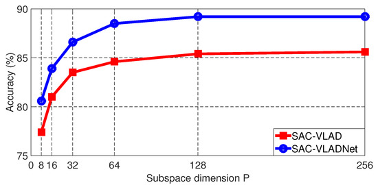 The final length of the SAC-VLADNet coding is determined by the subspace dimension (P). The Caltech256 [46] image recognition rates of the SAC-VLAD and the SAC-VLADNet with different P are shown in Figure 7, we set T and the dictionary size (K) as 7 and 128, respectively.