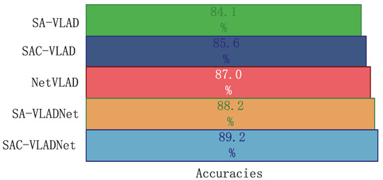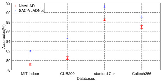 In this subsection, we give the statistical test of SAC-VLADNet and NetVLAD. Figure 9 shows the error bars of SAC-VLADNet and NetVLAD on 10 different data duplicates. The error bar shows that the proposed SAC-VLADNet increases the recognition rate by 2–4% over the NetVLAD, which demonstrates the great superiority of the SAC-VLADNet. We use the Matlab t-tests function to do the statistical test of the SAC-VLADNet and the NetVLAD. The statistical test results demonstrate that the differences between the proposed SAC-VLADNet and the NetVLAD are statistically significant when significance level .