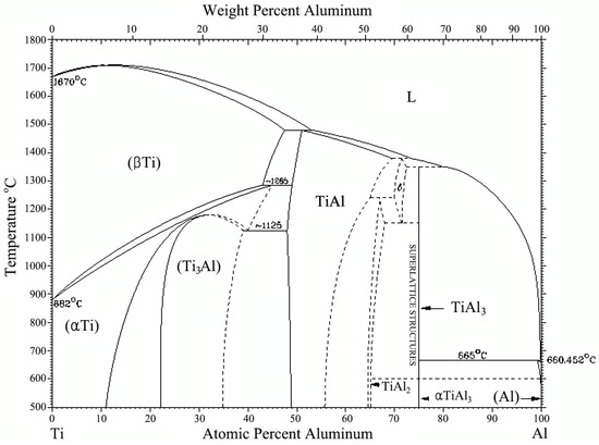 To design lightweight HEAs, we selected Al and Ti as the basic elements owing to their low density. The key idea of designing new HEAs using their binary phase diagrams is finding elements that mix. Therefore, the solubility of Al and Ti should be investigated first. Figure 1 shows the Al-Ti phase diagram [18]. It is very complex, and numerous intermediate ordered phases exist. However, β-Ti (BCC phase) and α-Ti (HCP phase) appear in the Ti-rich region as a solid solution. These solid solution regions suggest the possibility of the formation of single solid solution. Therefore, the lightweight elements, Al and Ti, could be the basic elements for lightweight HEAs.