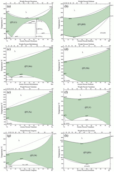 Ti-X phase diagrams where “X” is (a) Cr; (b) Hf; (c) Mo; (d) Nb; (e) Ta; (f) V; (g) W; and (h) Zr [18].