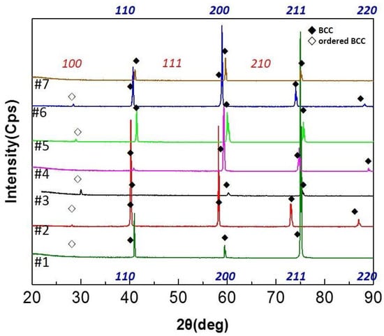 Ternary, quaternary, and quinary HEAs were designed by adding the selected elements to Al-Ti. Seven HEAs, numbered #1 to #7, were fabricated and their compositions are detailed in Table 1. The XRD profiles of the Al-Ti-containing HEAs are shown in Figure 3. The AlCrMoTi (#4) and AlCrMoTiV (#7) had a single BCC structure, and ordered BCC peaks appeared for the other HEAs.