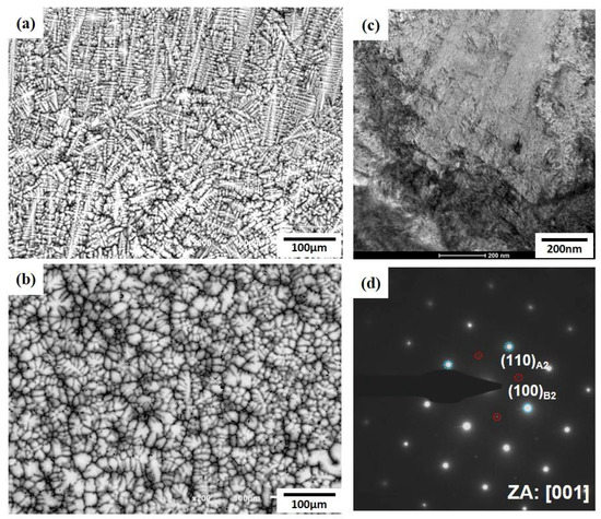The microstructures of AlCrMoTi (#4) and AlCrMoTiV (#7) which had a single BCC structure, are shown in Figure 4a,b. Both showed a dendritic morphology, and the dendritic growth was suppressed by the addition of V. The TEM analysis was performed for AlCrMoTiV (#7), and the results are shown in Figure 4c,d. Figure 4c is bright field image of AlCrMoTiV (#7) and Figure 4d is the diffraction pattern taken from [001]B2/BCC zone axis of Figure 4c. Although the XRD results demonstrate that it is a single BCC structure, diffraction pattern reveals (100) superlattice reflections marked with red-dotted circle that indicate an ordered B2 phase. Nano-scale B2 phases were observed; however, it was not detected by the XRD owing to their small fraction and size. Because AlCrMoTiV (#7) contained minor ordered precipitates, it could be defined as an ordered solid solution [19].