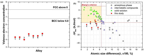 The empirical parameters, valence electron concentration (VEC), atomic size difference (δ), and enthalpy of mixing (ΔHmix) of the designed HEAs were calculated and are shown in Table 1 and Figure 5 [22]. The VEC and δ values satisfied the existing criteria. However, the ΔHmix values were positioned relatively below the alloys which form solid solutions (Figure 5b). All the HEAs satisfy Guo’s criterion although only AlCrMoTi (#4), AlMoTiV (#6), and AlCrMoTiV (#7) satisfy Zhang’s criterion. The microstructural analysis demonstrates that AlCrMoTi (#4) and AlCrMoTiV (#7) are ordered solid solutions; the empirical parameters of HEAs in present work agree with previous research and support the idea that using the binary phase diagrams can be a solution to screen the proper candidate elements for the design of novel HEAs.