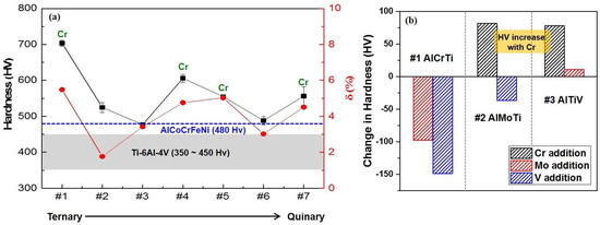 (a) Relationship between the hardness and atomic size difference; (b) hardness variation with the Cr, Mo, and V addition to ternary HEAs. The hardness increases remarkably with the Cr addition.