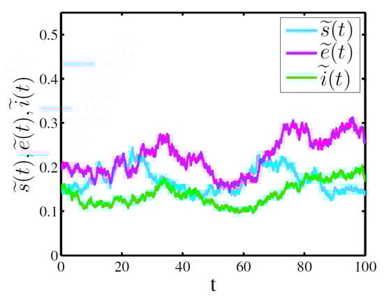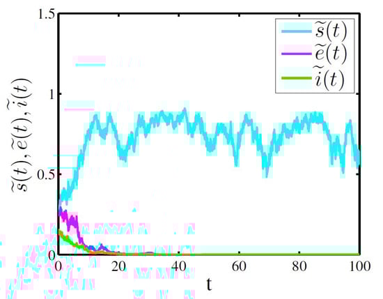 satisfy the parameter conditions in Theorem 2, we can get that the exposed and infective individuals go to extinction almost surely. Obviously, Figure 1 validates our results of the Theorem 2.