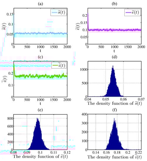 satisfies the parameter condition in Theorem 4, we can get that the stochastic system (6) has a unique stationary distribution and it has ergodic property. Figure 3 indicates that the solution of system (6) swings up and down in a small neighborhood. According to the density functions in Figure 3d–f, we can see that there exists a stationary distribution. As expected, Figure 3 supports our results of the Theorem 4.