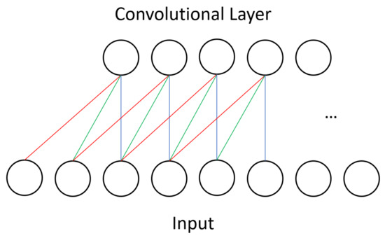 The connectivity in a CNN is sparse relative to the previously shown BM model. Additionally, the set of weights is shared between units, unlike in BMs. In this illustration we symbolize this with the red, green, and blue connections to show that each unit in the convolutional layer applies the same operation to different segments of the input.