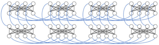 The hidden layer from Figure 4 is represented in one of D-Wave’s chimera cells here, with the cell’s bipartite connectivity made more obvious. The input/visible units of the LBM are left on a classical machine. Their contributions to the activity of the hidden units is reduced to an activity bias (represented with ± symbols) on those units. Figure 6 shows the overall chimera topology of the D-Wave device.