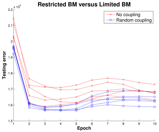 An initial experiment to demonstrate LBM utility. Reconstruction error (sum of squared error) of BMs trained on simulated data using no intralayer connections and using random intralayer connections with a small (0.0001) hidden-to-hidden weight learning rate. Here we show five RBMs (red) and five LBMs (blue), and the results suggest even just the presence of relatively static intralayer connections gives LBMs a performance advantage over RBMs. We obtained these results from the quantum annealing simulator provided by D-Wave.