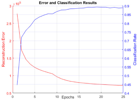 Reconstruction error and classification rate over 25 training epochs using 6000 MNIST images for training and 6000 for testing. Reconstruction error decreases as classification rate rises, confirming that the RBM learns the MNIST data distribution.