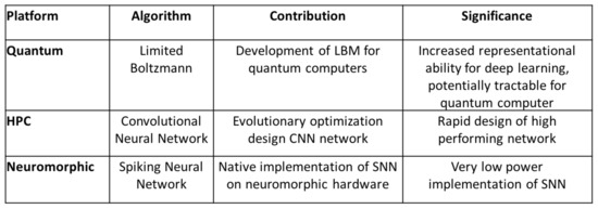 - Potok, T.E.; Schuman, C.; Young, S.; Patton, R.; Spedalieri, F.; Liu, J.; Yao, K.T.; Rose, G.; Chakma, G. A Study of Complex Deep Learning Networks on High Performance, Neuromorphic, and Quantum Computers. In Proceedings of the Machine Learning in HPC Environments, Salt Lake City, UT, USA, 30 January 2017; pp. 47–55. [Google Scholar]