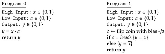 Consider that a binary secret must be processed by a program. As usual, a defender wants to protect the secret value, whereas an attacker wants to infer it by observing the system’s output. Assume the defender can choose which among two alternative versions of the program to run. Both programs take the secret value x as high input and a binary low input a whose value is chosen by the attacker. They both return the output in a low variable y (we adopt the usual convention in QIF of referring to secret variables, inputs and outputs in programs as high and to their observable counterparts as low). Program 0 returns the binary product of x and a, whereas Program 1 flips a coin with bias (i.e., a coin that returns heads with probability ) and returns x if the result is heads and the complement of x otherwise. The two programs are represented in Figure 1.
