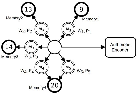 The cooperation is supervised by a soft blending mechanism [,] that gives importance to the models that had a better performance given an exponential decayment record []. Figure 1 depicts an example of the cooperation between five context and tolerant context models, namely . Each of these models has a probability (P) and a weight (W) associated.