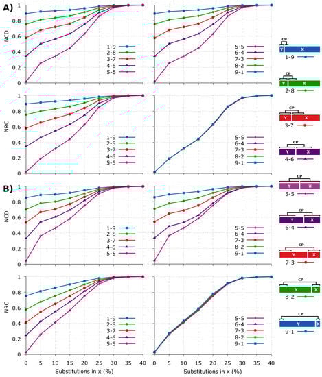 Comparison of the NCD (Equation (3)) and the NRC (Equation (5)) for several synthetic sequences with different substitutions applied on x. The sequences architecture is at right, where “CP” means copy. The substitutions in x are only applied after coping a region of y into x. Each pair, x and y, has a length of 1 MB. (A) the distribution of the sequences is uniform. For replication use the script runComparison.sh; (B) distribution is not uniform, and the sequences contain multiple repeats []. The numbers a-b stand for string sizes proportions, for example 1-9 means that y has size 0.1 MB and x 0.9 MB. For replication use runComparisonWithRedundancy.sh.