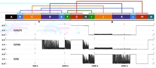 Comparison of the (top profile), the (middle profile) and the (bottom profile) given several types of rearrangements between x and y. The upper map depicts the multiple block regions that compose x and y. The region A and N identify unmatched sequences with high entropy, while H an unmatched sequence with low entropy. Region E and L are a copy of B (high entropy), both with 1% of substitutional mutations. Region J is a copy of C (high entropy) with 1% of substitutional mutations. Region K is a copy of D, both with low entropy. Region I is a copy of F, both with low entropy. Region M is a copy of G, both with high entropy. The sequences have been generated using XS [] and GOOSE (https://github.com/pratas/goose). For replication use runLocalMethod.sh.