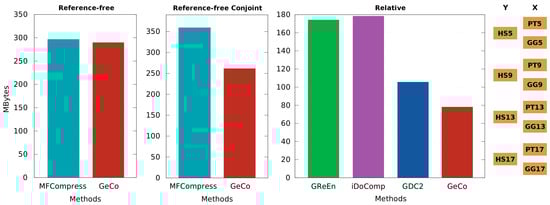 - Li, P.; Wang, S.; Kim, J.; Xiong, H.; Ohno-Machado, L.; Jiang, X. DNA-COMPACT: DNA Compression Based on a Pattern-Aware Contextual Modeling Technique. PLoS ONE 2013, 8, e80377. [Google Scholar] [CrossRef] [PubMed]
