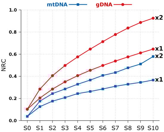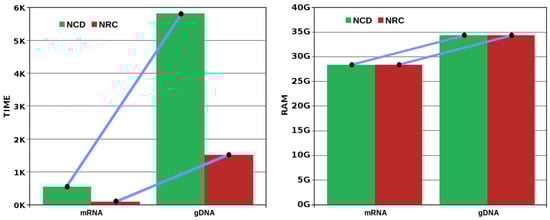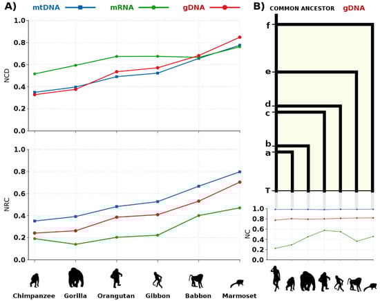 The quantity of mutations that have been accumulated between two genomes provides a record of the time elapsed since their common ancestor []. The NCD and NRC are measures that are able to quantify variation, particularly because they measure information between and across DNA sequences. Moreover, when using relative measures, we can extend it to profile the information content enhancing relations and correlations between the data [].
