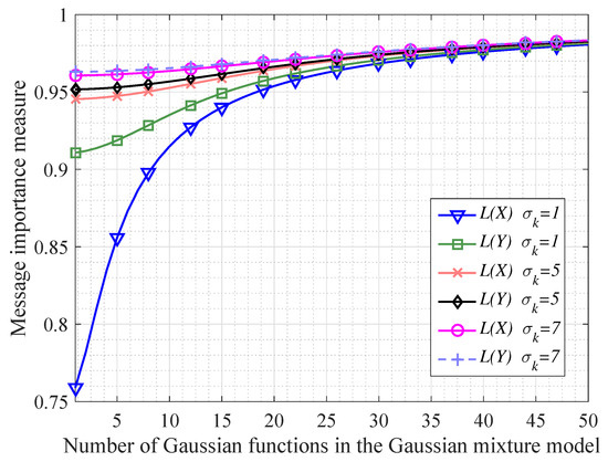 The comparison between the message importance measures for the original variable X and the final variable Y in an information transfer processing (where the variable X follows a Gaussian mixture model with all the variances of Gaussian functions as same as ).