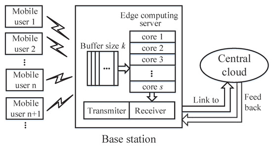 In terms of a MEC system in Figure 4, it consists of many mobile users, an edge server, and a central cloud located far from the local devices. For each mobile user, a part of or all the service requests can be offloaded to the corresponding edge server when the communication is disturbed by other mobile users or environmental noise. If the upper bound of the service rate for the edge server is larger than the sum of mobile users’ request rate, the offloaded requests will be coped with by the edge server. Otherwise, the overloaded requests will be offloaded to the central cloud for processing [35]. In these cases, the queue model on the edge server can be considered as the M/M/s/k queue, where the first M describes the request interarrival time of mobile users, the second M denotes the request service time in the edge server, and both of them follow exponential distribution; the parallel processing core number is s, which means each processing core can at most server one request simultaneously; the queuing buffer is k in the edge server. Note that we only consider a simple model on MEC to show the potential application of MITM. In fact, there may be some complicated cases in the MEC such as fault tolerance, failover, and the existence of overlay networks, etc.; we shall consider this in the near future.