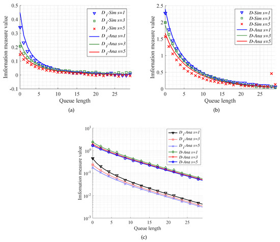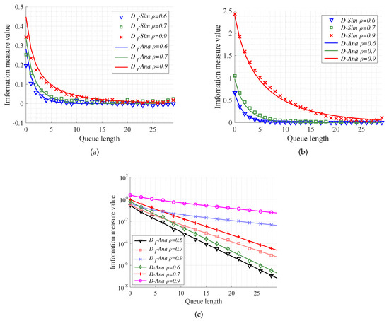 We now exploit M/M/s/k model to investigate performance of the MITM and KL divergence in the case of different traffic intensity. In the simulations, the queue length, namely the buffer size, is set to change from 0 to 30, the number of servers satisfies , and the traffic intensity is set as . Then, we can compare the simulation results with the theoretical ones for the MITM and KL divergence. From Figure 5, it is seen that the analytical results mentioned in Equations (59) and (60) can validate the simulation results. In particular, Figure 5a,b shows that analytical results of MITM and KL divergence can absolutely fit the simulation experiments in the M/M/s/k models with different traffic intensity. What is more, from Figure 5c, we can see that in the same queue model the convergence for MITM is faster than that for KL divergence. That is, the MITM offers a reasonably lower bound for queue length selection with respect to MEC. Besides, the less traffic intensity we have, the more caching size resources can be saved.