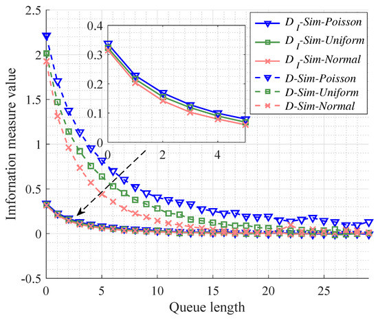 The performance of different information measures between the queue length k and ∞ for the queue models with the same number of server , the same traffic intensity , and the different arrival events’ distributions.
