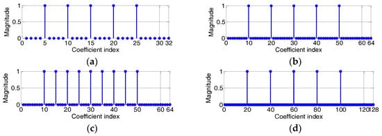 Impulsive response of the sparse system: (a) sparsity rate (SR) = 5/32; (b) SR = 5/64; (c) SR = 9/64; (d) SR = 5/128.