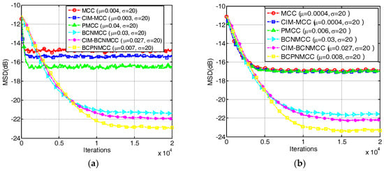 In the first example, we investigate the convergence performance of all algorithms mentioned above in terms of MSD under different sparsity rates. The step sizes are selected so that the same initial convergence speeds are obtained for all algorithms. The convergence curves are given in Figure 3a,b under different SRs (5/64 and 9/64). The results indicate that (1) the bias-compensated aware AFAs can achieve lower steady-state misadjustment than other algorithms because the bias caused by the noisy input can be effectively compensated by the bias compensation term; and (2) the noisy input has a remarkable influence on the identification performance of the AFAs for SSI. Consequently, it is meaningful to study the sparse-aware bias-compensated AFAs. In addition, we give the convergence curves of the BCNMCC, CIM-BCNMCC, and BCPNMCC algorithms with sparsity levels and in Figure 4. One can see that the proposed algorithms show better steady-state accuracy than the BCNMCC algorithm, which illustrates the advantages of the proposed methods for SSI. In particular, no matter how sparse it is, the BCPNMCC algorithm performs better than the CIM-BCNMCC algorithm, which is consistent with the results in [24]. Hence, we mainly perform simulations to investigate the performance of the proposed BCPNMCC algorithm in the following examples.