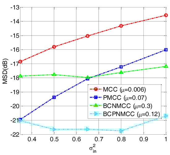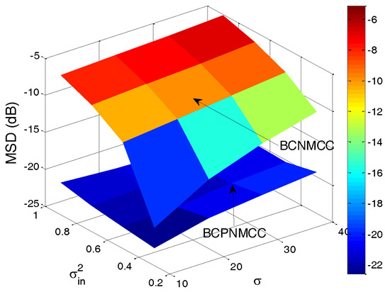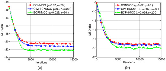 The structure of Equation (36) is similar to that of Equation (10), and the proposed BCPNMCC algorithm will reduce to the BCNMCC algorithm when the gain matrix is the unity matrix. In addition, we know that Equation (36) will be equivalent to Equation (15) when the input noise variance is zero. Hence, the proposed BCPNMCC algorithm shows advantages of both the BCNMCC and PMCC algorithms. Furthermore, the variance of the input noise is usually unknown and it should be estimated effectively; we employ the method proposed in [35] to estimatein this work.