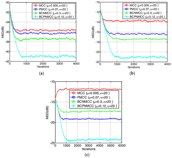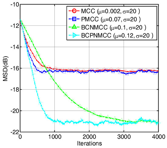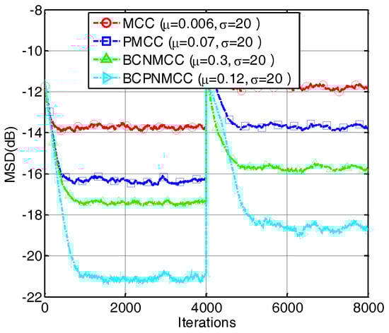 In the third example, we compare the convergence speed of the proposed algorithm with those of other algorithms. The step sizes are selected to obtain the same MSD for each algorithm. The convergence curves are shown in Figure 7; one can observe that the proposed BCPNMCC algorithm shows outstanding convergence speed compared with BCNMCC algorithm because of the adaptive step size adjustments by the gain matrix. Compared with the MCC algorithm, the BCPNMCC algorithm shows a better steady-state MSD because of the proportionate update scheme and bias compensating term.