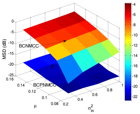 Finally, the joint effect of the performance on the free parameters is quantitatively investigated, with a curved surface for the relationship of steady-state MSD and parameter pairs ( and , and ) presented. The steady-state MSD results are given in Figure 10 and Figure 11. One can observe in Figure 10 that the steady-state accuracy will decrease with the input noise’s variance increasing; this result is most pronounced when the input noise’s variance and output noise’s variance are in the ranges of (0.2–1) and (10–40). A similar conclusion can be obtained in Figure 11: as the step size increases, the steady-state accuracy of the proposed algorithm decreases obviously, and it is most pronounced when the step size’s and input noise’s variance are in the ranges of (0.08–0.16) and (0.2–0.1). In addition, one can also see that the proposed algorithm outperforms the BCNMCC algorithm in this case.