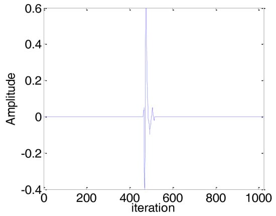 In this subsection, we consider a computer simulation of the scenario of sparse echo channel estimation to evaluate the performance of the proposed BCPNMCC. The echo channel path is given in Figure 12, and it commutes to a channel with length M = 1024 only and 56 nonzero coefficients. We use a fragment of 2 s of real speech as the input signal, sampled at 8 kHz. The measurement impulsive noise is , and the input noise variance is . The other parameters are set in order to obtain the optimal performance for all algorithms. The convergence curves are shown in Figure 13. Compared with other algorithms, the proposed BCPNMCC algorithm works well in this practical scenario, again demonstrating the practical character of the proposed algorithm for engineering applications.
