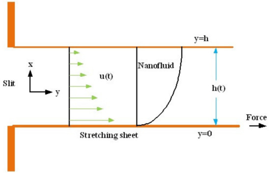 In the past few years, it has been observed that the entropy generation on nanofluid flow analysis has significantly contributed in the area of industries, engineering and technology as well as in other emerging fields of science. Actually, entropy is a thermodynamic quantity representing the unavailability of a system’s thermal energy for conversion into mechanical work, often interpreted as the degree of disorder or randomness in the system. In other words, entropy is a measure of the energy dispersal in the system. We see evidence that the universe tends towards highest entropy many places in our lives. A campfire is an example of entropy. The solid wood burns and becomes ash, smoke and gases, all of which spread energy outwards more easily than the solid fuel. Thin film flow problems have diverse applications in many fields, fluctuating from specific situations in the flow in human lungs to lubrication problems in engineering, which is probably one of the largest subfields of thin film flow problems. The practical applications of thin film flow is a challenging interplay between fluid mechanics and structural mechanics. A nanofluid is comprised of a base fluid with tiny (nanometer) sized nanoparticles, such as carbides or carbon nanotubes, oxides, and metals, whereas traditional base liquids involve ethylene glycol, oil, and water. A nanofluid is very helpful in enhancing thermal conductivity and convection of heat transfer coefficient when it is analyzed with the base fluid. In modern technology, nanomaterials are becoming increasingly important in the performance of various heat exchangers, such as microelectronics, optical modulators, and chemical production. Magneto-nanofluids are also remarkable for their use in various applications, such as tunable optical fiber filters, magneto-optical wavelength filters, optical modulators, and optical switches. In biomedical engineering, magneto-nanoparticles are also very helpful in cancer therapy, sink-float separation, hyperthermia, magnetic resonance imaging (MRI), magnetic cell separation, drug delivery, and magnetic drug targeting. In particular, heat transfer and convective flow are influenced by the features of nanofluids, such as thermal conductivity and viscosity. Conventional heat transfer in various Newtonian and non-Newtonian fluids, such as ethylene glycol, oil, water, etc. holds a poor rate of heat transfer. However, the thermal conductivity of these kinds of fluids plays a significant role in the heat transfer coefficient between a heat transfer surface and heat transfer medium. During the last few decades, an innovative methodology has been used to enhance heat transfer with the help of ultra-fine solid particles in fluids. Non-Newtonian fluids are of various kinds; thus, all non-Newtonian fluids cannot be addressed by using single constitutive expression between stress and shear rate. Much attention has been devoted to study different models of non-Newtonian fluids. Among them is an Eyring–Powell fluid model, which is very complex, but it has certain advantages over other fluid models. Firstly, it was derived from a kinetic theory of liquids rather than the empirical relation as in the case of the Power-law model. Secondly, it appropriately reduces to Newtonian behavior for low and high shear rates. The Eyring–Powell fluid model describes properties of shear thinning fluids. Examples of such fluids are human blood, ketchup, toothpaste, etc. Thus, researchers are attracted to investigate its thermo physical properties. In view of all these applications, it becomes an important issue for researchers to develop the study of liquid film flow on the stretching sheet. The flow of liquid film was first studied for viscous flow and further it is extended to non-Newtonian fluids. Crane [1] was the first one who deliberated the motion of viscous fluid in a linear stretching surface. Dandapat [2] studied the flow of viscoelastic fluids having a heat transfer on a stretching sheet. Wang [3] was the pioneer to investigate unsteady stretching surface and finite liquid film flow on it. Usha and Sridharan [4] have worked on the same problem and extended it to liquid film fluid with heat transmission analysis on horizontal sheet. Liu and Andersson [5] have used numerical techniques in their work to obtain solutions and discussed parameters. Aziz et al. [6] observed the effect of inner temperature production in an unsteady stretching sheet due to flow in a thin liquid film on it. Tawade et al. [7] inquired the flow of thin fluid on an unsteady porous surface having thermal radiation, in the existence of magnetic field, applying Newton Raphson and Runge–Kutta Fehlberg formulae for solutions of nonlinear equations. A brief discussion is given on physical parameters in his work too. Thin film flow of non-Newtonian fluids are in abundance in many walks of life. Therefore, it is one of the most common factors of the nature which is mostly used in the field of industry , engineering and technology. Andersson [8] was the pioneer to study flow of thin liquid film of non-Newtonian fluids by taking into account the Power Law model in an unsteady stretching sheet. After that, most of the researchers [9,10,11,12] have investigated the Power Law of fluid using different cases in an unsteady stretching sheet. Megahed et al. [13] observed thin film flow of Casson fluid and temperature transmission in existance of viscous dissipation and variable heat flux with slip velocity. Abolbashari et al. [14] explored the same fluid with entropy generation with nano particles. Recently, Qasim et al. [15] applied Buongiorno’s model to study thin film of the nanofluid taking an unsteady porous sheet. Eyring–Powell fluid is an integral part of non-Newtonian fluids. Many researchers investigated the effect of MHD and heat on Eyring–Powell fluid. The at hand amount of study in the form of nanofluids is less than the least amount. Hayat et al. [16] derived Ey