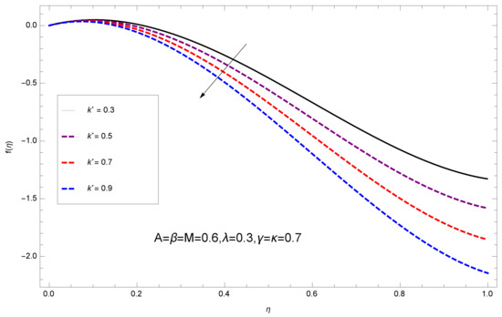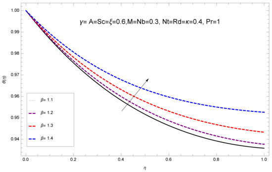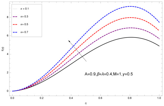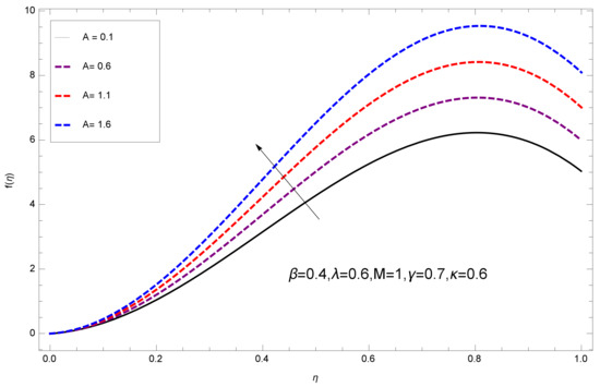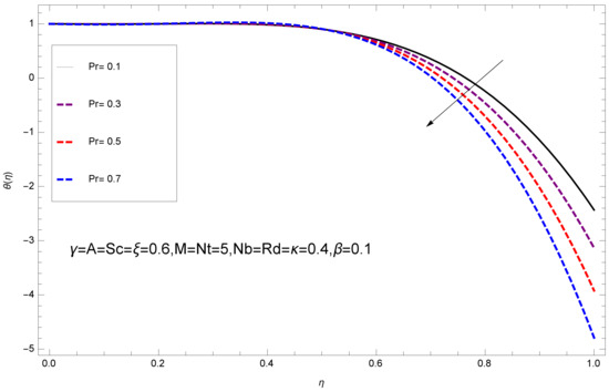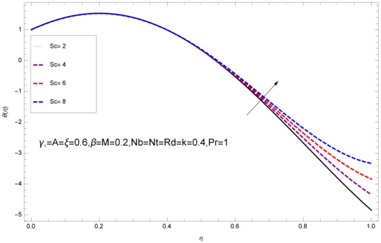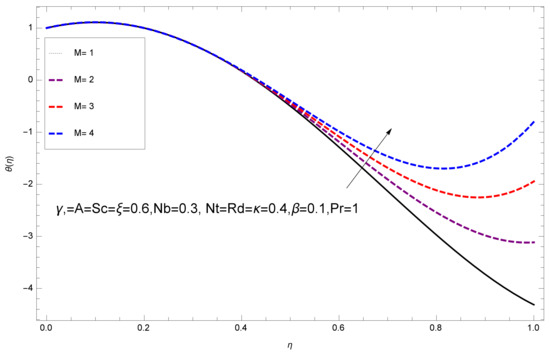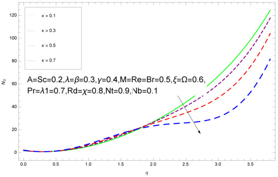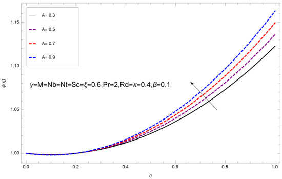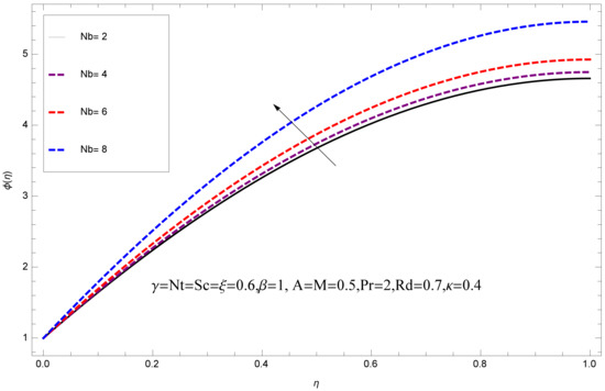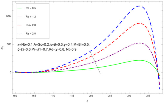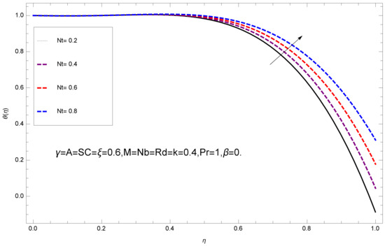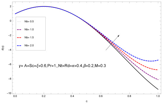 This section deals with the theoretical and graphical behavior of different physical quantities that are obtained in the present flow problem. The computational software Mathematica has been utilized to investigate the novelties of all the physical parameters. Figure 3 shows the physical model of the problem. The graphs of h-curve for different order Approximation are plotted in Figure 1 and Figure 2 for various values of embedded variables. The h-curves consecutively display the valid region. In particular, we discuss the influence of various embedded parameters on velocity profile, temperature profile, nanoparticle concentration profile, and entropy profile. The graphical explanation of these parameters has been displayed in figures [4,5,6,7,8,9,10,11,12,13,14,15,16,17,18,19,20,21,22,23,24,25,26,27,28]. The influence of unsteady constraint A on the profile illustrated in Figure 4. The velocity field rises with the rise in unsteady parameter A. The effect of film thickness has been demonstrated for various values of fluid velocity mentioned in Figure 5. It is seen that falls over with higher values of .The impact of Erying fluid factor k over the is exposed in Figure 6. It has been observed that, when Erying fluid parameter k increases, then it raises the nanofluid film motion, and this effect is clear at the stretching surface. The characteristics of magnetic factor M on fluid velocity profile is shown in Figure 7. It is obvious from mathematical formulation that the magnetic parameter M is inversely varied with velocity distribution . Increasing magnetic parameter M decreases the velocity field. This influence of magnetic field is caused by the production of friction force to the movement known as the Lorentz force, which brings retardation to the flow of the fluid and hence reduces fluid velocity at the edge.The characteristics of porosity parameter on velocity field is shown in Figure 8, which have an imperative character in the flow motion. Increasing increases the porous space which creates resistance in the flow path and reduces the flow motion. In fact, growing values of show the large number of porous spaces, which create resistance in the flow path and reduce overall fluid motion. Basically, with the increaseing number of holes in the porous plates the nanoliquid particles face hurdles in flow over these holes. Throughout this motion the way is not clear and the fluid has to decrease its velocity at any point. The unsteady parameter A has an opposite effect on temperature profile. Figure 9 depicts that temperature depreciates with the unsteady parameter A. Each and every fluid has the similar effect on temperature for the unsteady parameter A. The fluid produces confrontation to the flow of film and shows a tendency to reduce the velocity of fluid flow having larger values of and it is clear in Figure 10. The fluid film size absorbs heat that causes fall down in temperature distribution. The characteristics of magnetic factor M on temperature profile is shown in Figure 11. The steepness in the temperature profiles decreases with decreasing the width of the thermal boundary layers. The free surface temperature is increased with the Brownian motion constraint as illustrated in Figure 12. Actually, Brownian motion is the erratic random movement of microscopic particles in a fluid, as a result of continuous bombardment from molecules of the surrounding medium. The reality is that arbitrary motion of particles of the fluid generates collision in the particles. Increase in the value of Brownian motion constraint results in an increase in temperature of the fluid. Consequently, it causes reduction in free surface nanoparticle volume fraction. Due to kinetic molecular theory, the heat of the fluid increases due to the increase of Brownian motion. Thus, the given result is in good agreement with the real situation. The thermophoresis parameter faces depreciation in contrast with temperature profile. This phenomenon is described by Figure 13. The thermophoresis limitation supports growing the surface temperature. The irregular moment of nano suspended particles in the fluid represented the Brownian motion. Due to this irregularity in motion, nano suspended particles produce kinetic energy and the temperature increases; as a result, the thermophoretic force is initiated. This force causes intensity in the fluid to move away from the surface of the stretching sheet. Subsequently, the temperature inside the boundary layer rises as grows.Physically, Prandtl number is the ratio of kinematic viscidness to thermal diffusivity and is a dimensionless quantity. The is increased when the value of momentum diffusivity is greater than the thermal diffusivity. Thus, heat transmission at the surface grows with the increase in values while mass transmission is concentrated as the Prandtl number grows. The impact of is given in the Figure 14. It clearly shows that reduces with large number. The logic behind this is that, with the large value of , thermal layer of the boundary reduces. The consequence is more noticeable for slight Prandtl quantity as the width of the thermal boundary layer is relatively greater. The influence of parameter on temperature is presented in Figure 15. Thermal radiation has an imperative part in inclusive surface heat transmission when the coefficient of convection heat transmission is small. When we increase the value of , it is perceived that it augments the heat in the boundary layer of the fluid. This increase causes a drop in the rate of cooling in nanofluid flow. The heat field increases with the change in the Schmidt number illustrated in Figure 16. It is obvious that the flow part increases in the horizontal direction by giving rise in the Schmidt number. It is trivial that, with a rise in the Schmidt number, the flow part increases in the x-direction. The logic behind is that the Schmidt parameter is the ratio of momentum and concentration diffusivities. The rise in t