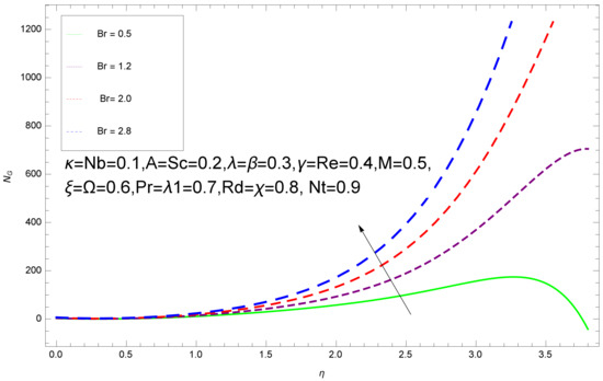 Here, and represent the components of fluid velocity, denotes the coefficient of kinematic viscosity, represents density where as and represent the electrical conductivity and dynamic viscosity respectively, T represents the temperature, is thermal diffusivity, K represents porosity, represents specific heat, thermal conductivity of fluid is represented by , Brownian diffusion coefficient is denoted by , , where denotes the base fluid density and represents density of particle, and C is the coefficient of volumetric expansion. indicates the radioactive heat fluctuation, which is given by Rosseland approximation as