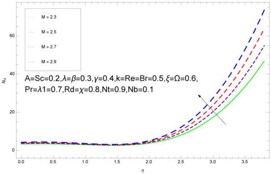 - The temperature gradient and concentration fields are both directly related with magnetic field.