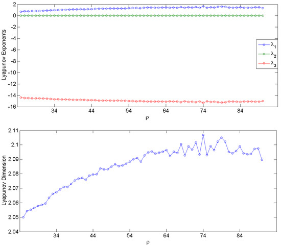 The three Lyapunov exponents of the 3-D Lorenz system (top panel) and the Lyapunov dimension (bottom panel) as a function of the model’s Rayleigh number .