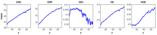Next, we performed MMP analysis on the three-dimensional time series generated from the Lorenz system for every value of and all five measures of complexity were estimated per time series. One thousand time series for (x, y, z) of 200 data points each were generated with 1000 randomly selected initial conditions for each . The mean values of the measures over the 1000 simulations per value are shown in Figure 2. They were then compared to the ones of the Lyapunov dimension in Figure 1 in search of common behavior as the complexity of the system changes with the change of . Since each complexity measure has different units and range, e.g., the Lyapunov dimension is unitless and less than 3, GAD is measured in number of Gabor atoms (from 1 to 200), NGE is normalized from 0 to 1, etc., the trends in complexity with the increase of were compared. As increases, GAD, GE, NGE show the increase of the complexity of the system, in agreement with the complexity determined by the Lyapunov dimension. GMF also increases monotonically indicating that the increase in complexity of this system is accompanied with an increase in the central frequency of the signals. remains constant up to = 60, and decreases thereafter indicating that changes in the system’s complexity are not captured by measures such as which accounts only for the variability (energy) of the signals.