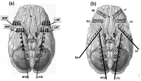 Electrode montages for the analyzed intracranial EEG recordings: (a) strip electrodes placed on the right and left orbitofrontal (ROF and LOF, respectively), and right and left subtemporal cortex (RST and LST, respectively) and depth electrodes on the right and left hippocampus (RTD and LTD, respectively); and (b) electrodes placed in same places as in (a) and additional depth electrodes placed on the right and left amygdala (RA and LA, respectively), and right and left frontal areas (RO and LO, respectively).