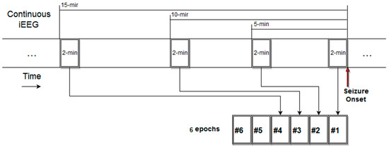 Diagrammatic representation of the temporal location of the six preictal EEG epochs that were analyzed from the available 1 h preictal iEEG recordings per seizure and patient.