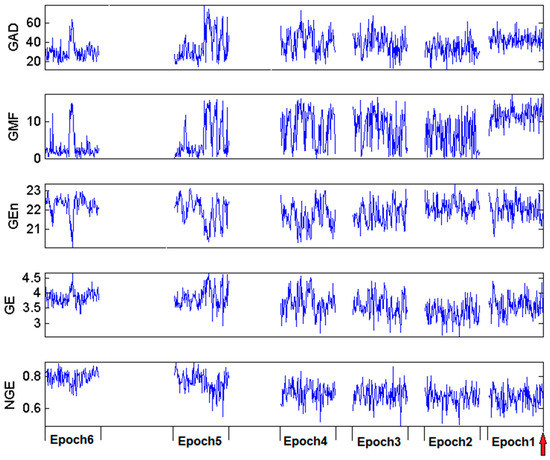 The estimated 120 values of the Gabor complexity measures GAD, GMF, GEn, GE, NGE within each of the six EEG epochs before a clinical seizure in one of our patients are shown in Figure 5. Variations of the values (short term variability) are observed for almost all measures. By visual inspection of this figure, a lack of consistency of a trend across epochs is observed in all Gabor measures of complexity except for NGE. In particular, GAD shows high values in Epochs 5, 4, 3 and 1; GMF shows highest values in Epoch 1; GEn shows no visible differences across epochs; and GE shows a downward trend up to Epoch 1 at which it takes higher values. The normalized Gabor entropy (NGE) exhibits a consistent trend across epochs, that is, a slow but progressive drop across epochs of the (visually estimated) mean of NGE values per epoch as the seizure onset approaches.