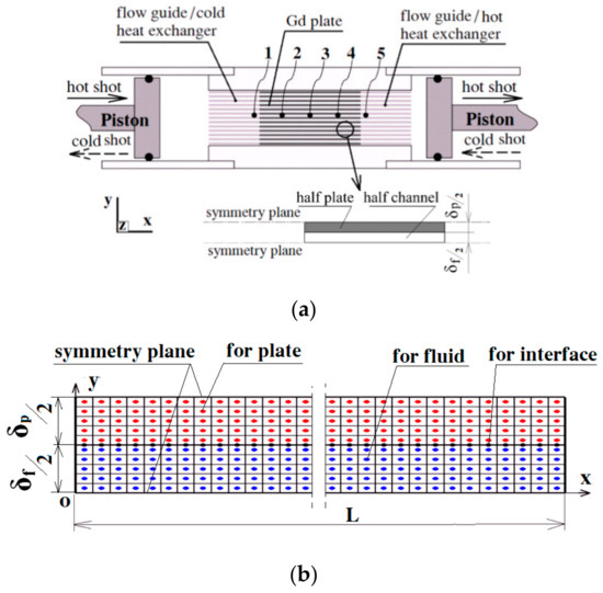 Figure 1a depicts the reciprocating magnetic refrigeration apparatus of Gd plates studied by the Risø DTU [19,26]. In their apparatus, the thickness (δp) and streamwise length (L) of the Gd plates were 40 mm of 0.9 mm, respectively, and the channel width, or the gap, between two adjacent plates (δf) was 0.8 mm. Five thermocouples were arranged to measure the fluid temperatures and the temperature span (∆THC) was determined by the subtraction of the 5th and 1st thermocouples under the no load condition. During the hot (or cold) blow, the two pistons on the two ends of the apparatus moved synchronously towards the right (or the left). The magnetic field (μ0H) at the center of the pole gap was ~1.0 T, while the average field in the “out of field” position was ~0.16 T due to the stray field of the electromagnet [19].